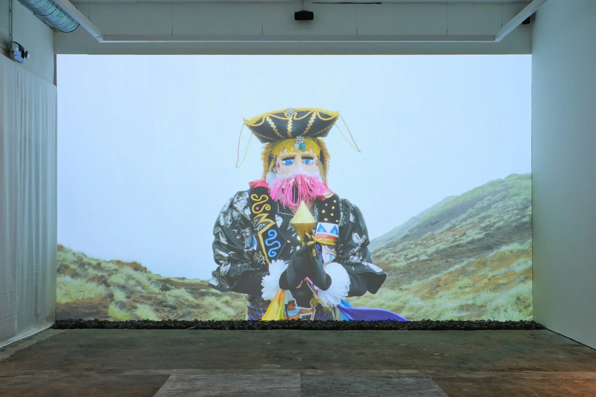 In the video installation, "Tierra Retumbante," ELYLA draws on the poetic egregore of The Masaya Volcano or Popogatepe, a Manque term meaning "mountain that burns," a powerful symbol of the land and spirit from pre-Hispanic and colonial times. Located in the heart of the Pacific Ring of Fire, it is a place where volcanoes ignite their underground incandescence, and the living cultures of the continent connect with that seething, flowing lava. Vertigo and dance, past and present, abyss and flight, all fuse through this corporeality that chooses dissent while honoring ancestral heritage. Elyla achieves this by addressing the 16th-century folkloric theatrical masterpiece of "El Güegüense,” re-designing “Güegüense” costumes informed by the history of LGBTQ rights in Nicaragua crafted in collaboration with the Navajo artist and biologist Sierra Pete.