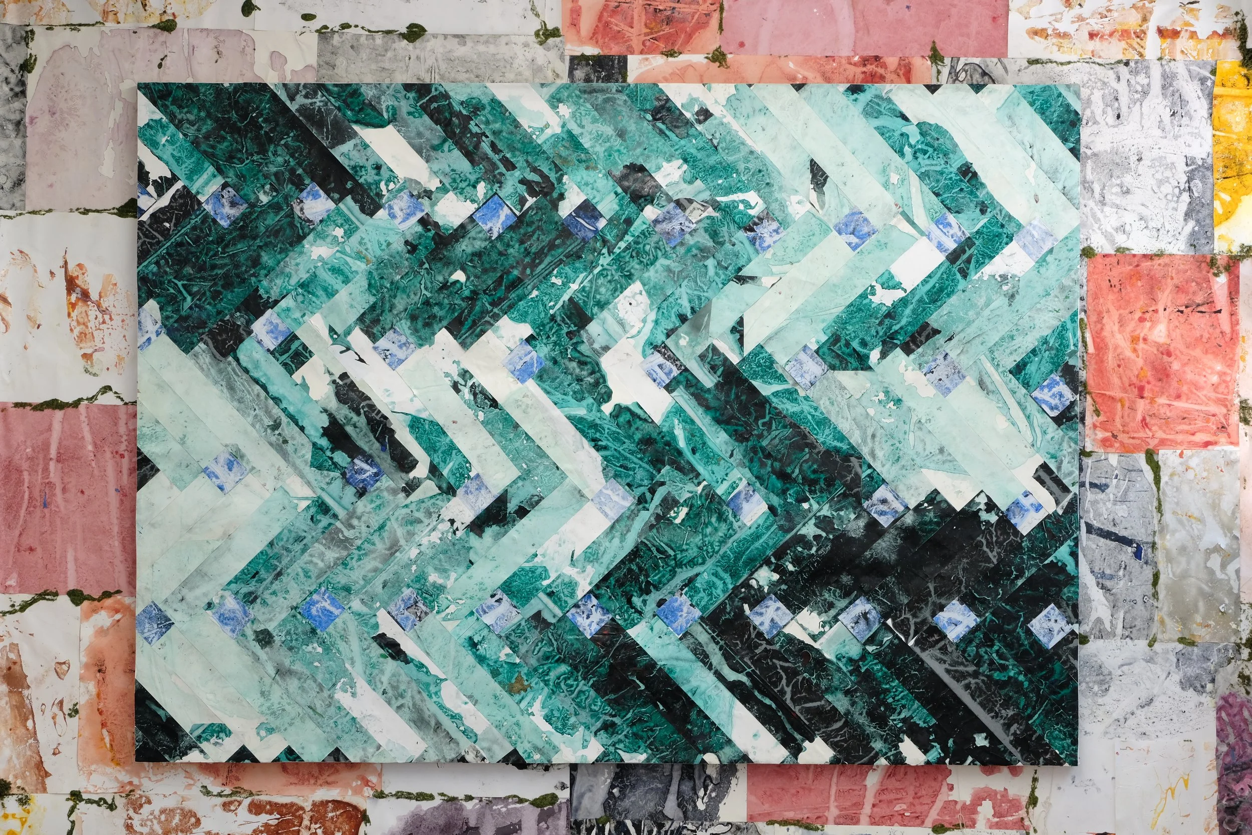The paintings are rooted in an energetic and responsive process; Laumann's works are constructed with paint and paper mounted on canvas. Applied to the surface by being torn, cut, glued, and reapplied in a chaotic yet methodical manner. They sometimes resemble colorful natural stone surfaces or brightly painted gunmetal. The works result in a highly textured surface, discordant but organized. Changes in the direction of swatches add to the compelling nature of this trompe l'oeil effect. Lineal Interruptions create an overall exuberant topographical experience of electrified labyrinths that exist as a visually active meditation.