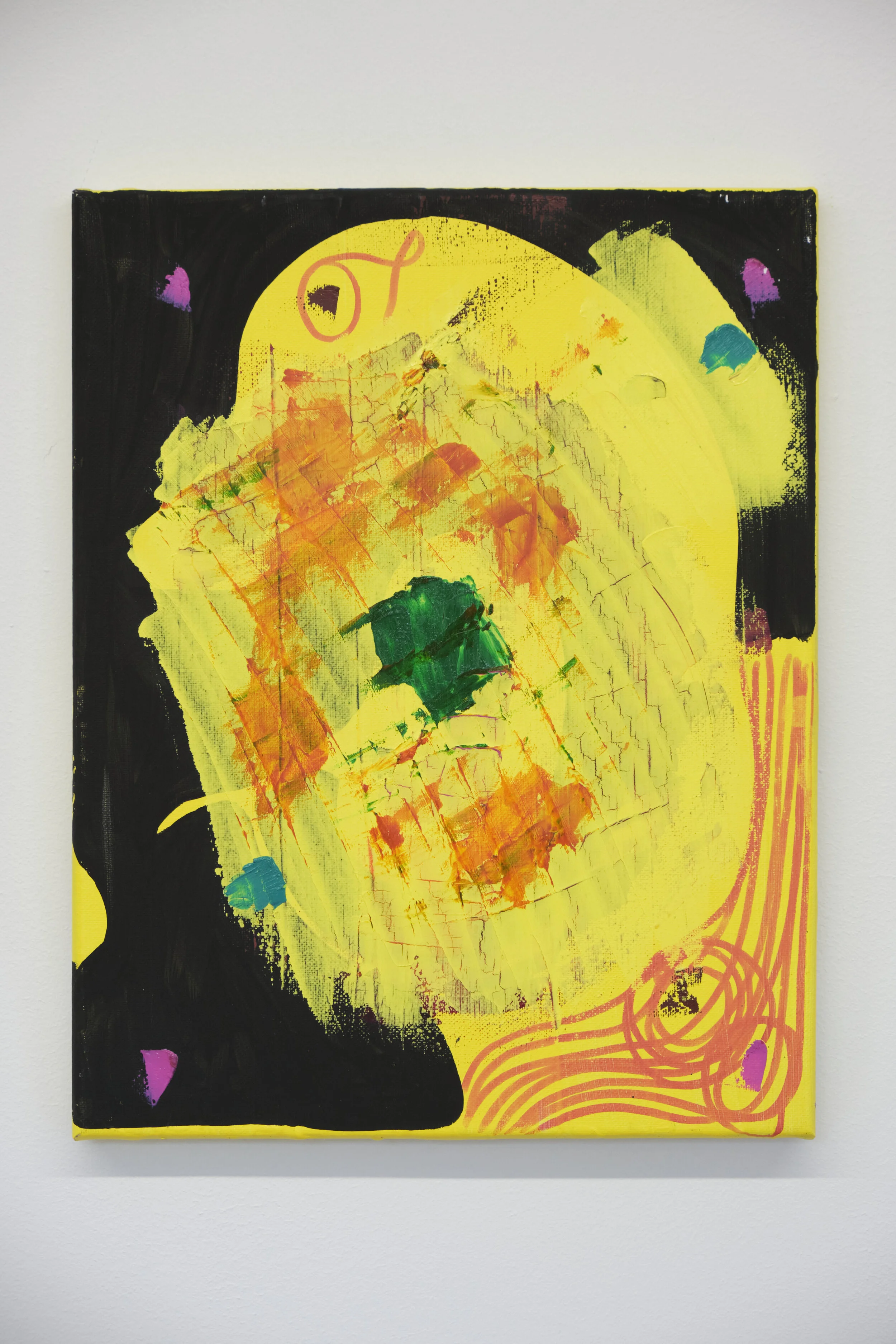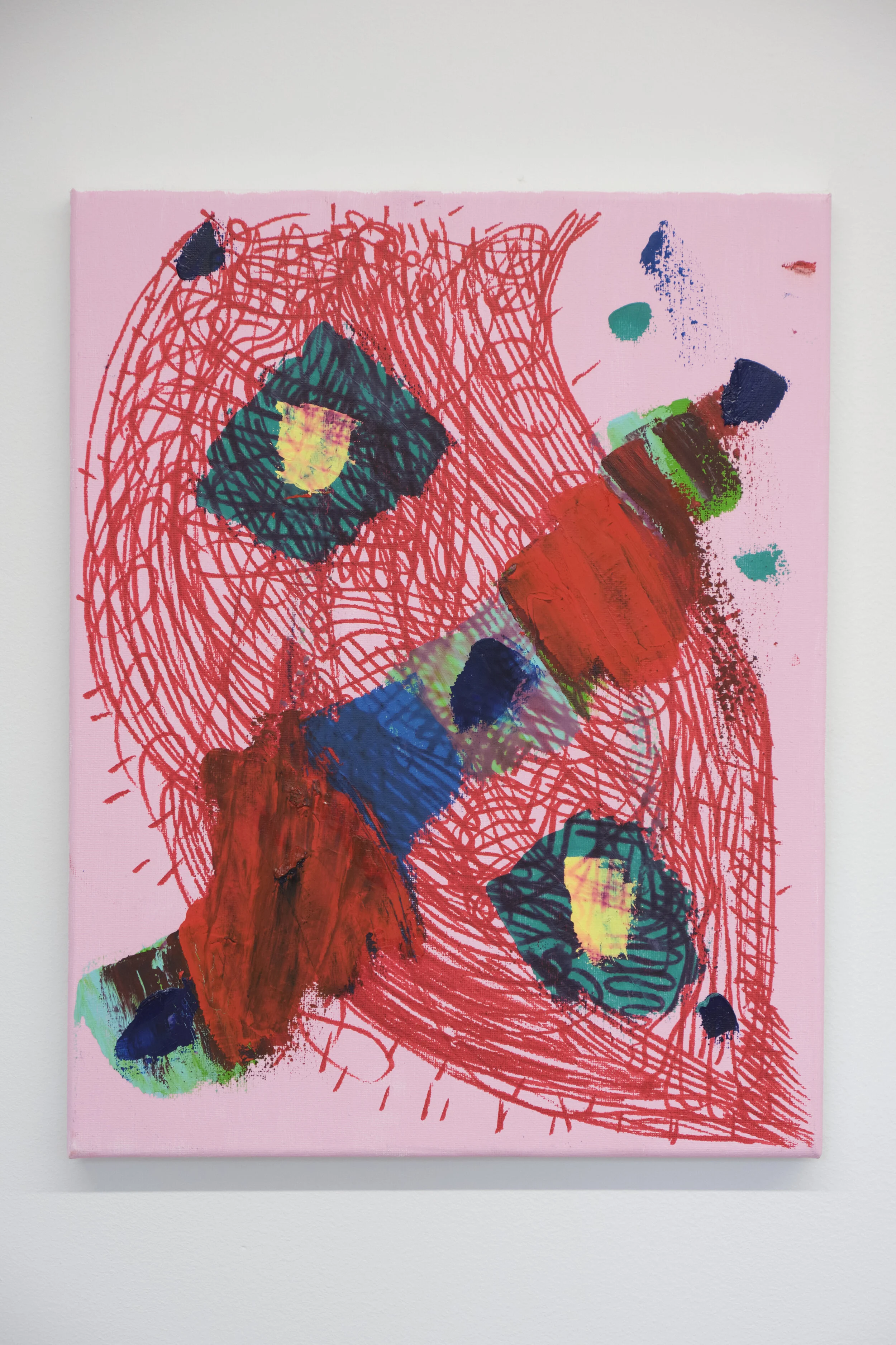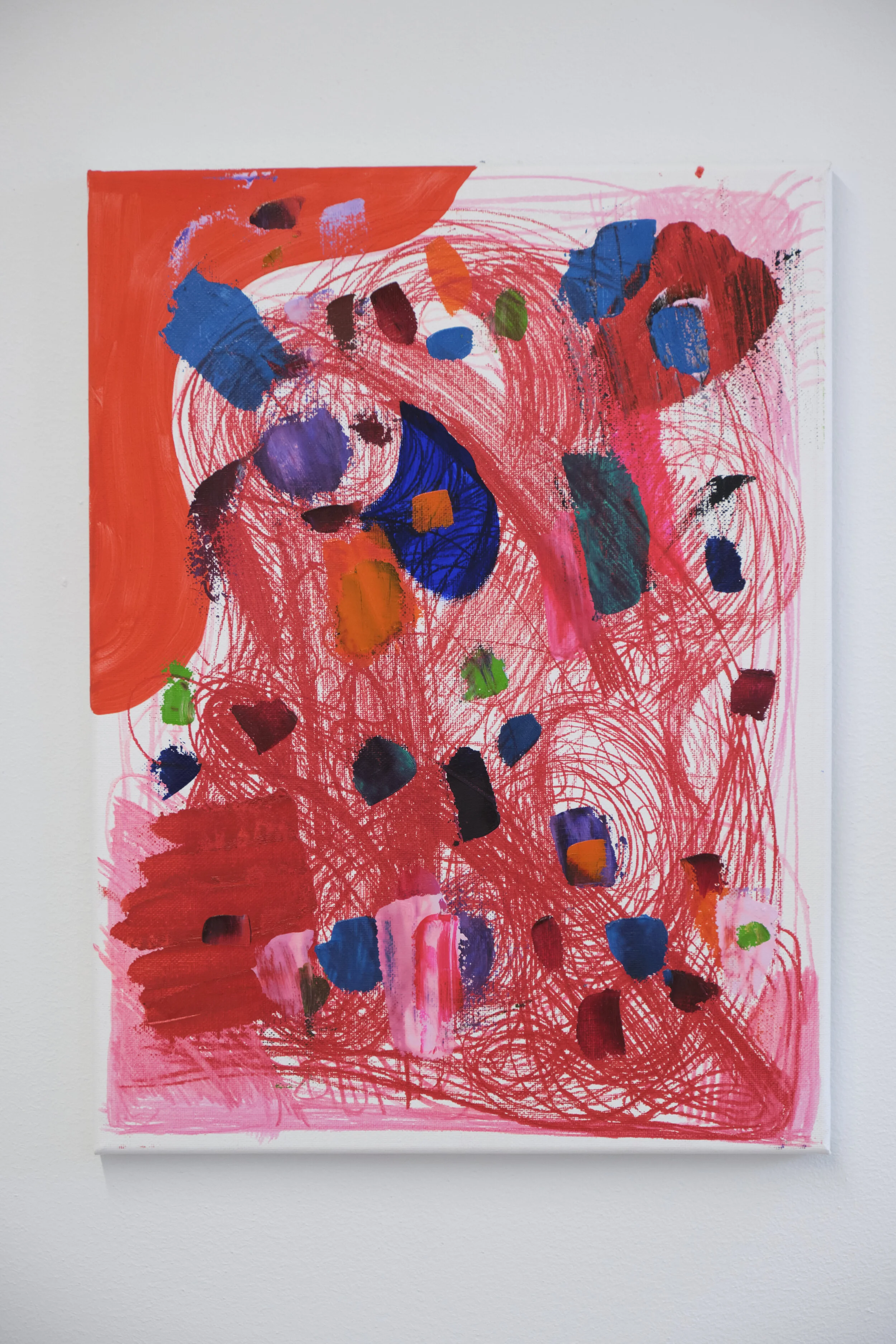 Similar to annotations in notebooks and handmade books the artist makes, the works become a joyful collection of mark-making. Over time they become more than a collection of moves and a structure eventually emerges. The paintings refuse to adhere to the “golden rules” and are unguided by preexisting ideas, either of the artist's own making or that of painting culture itself. The results become combinations of these elements in their random unconscious way.