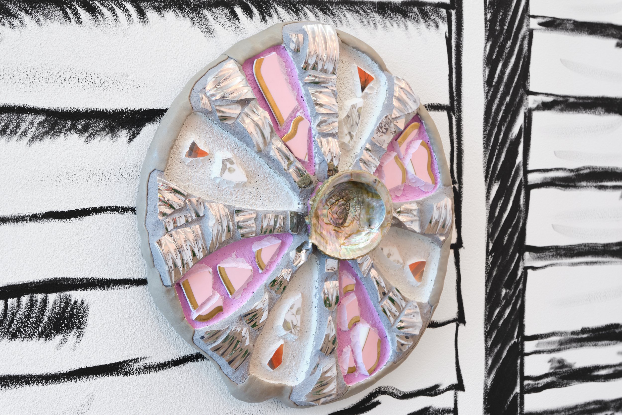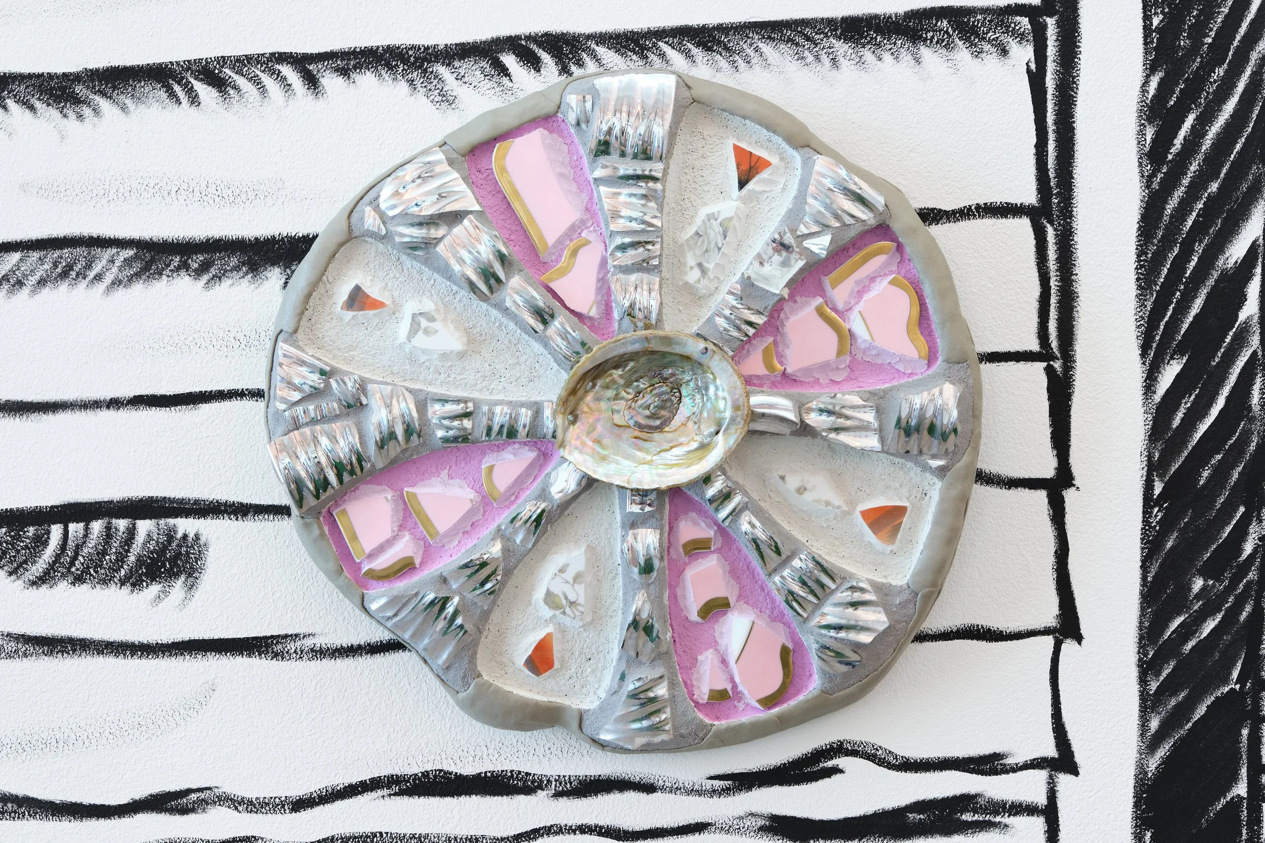 Image: Kelly Breez, Sunset Dock Beer, 2025, Broken tile, cement, framed in walnut wood, 14.125 x 11.25 x 1.75 in.