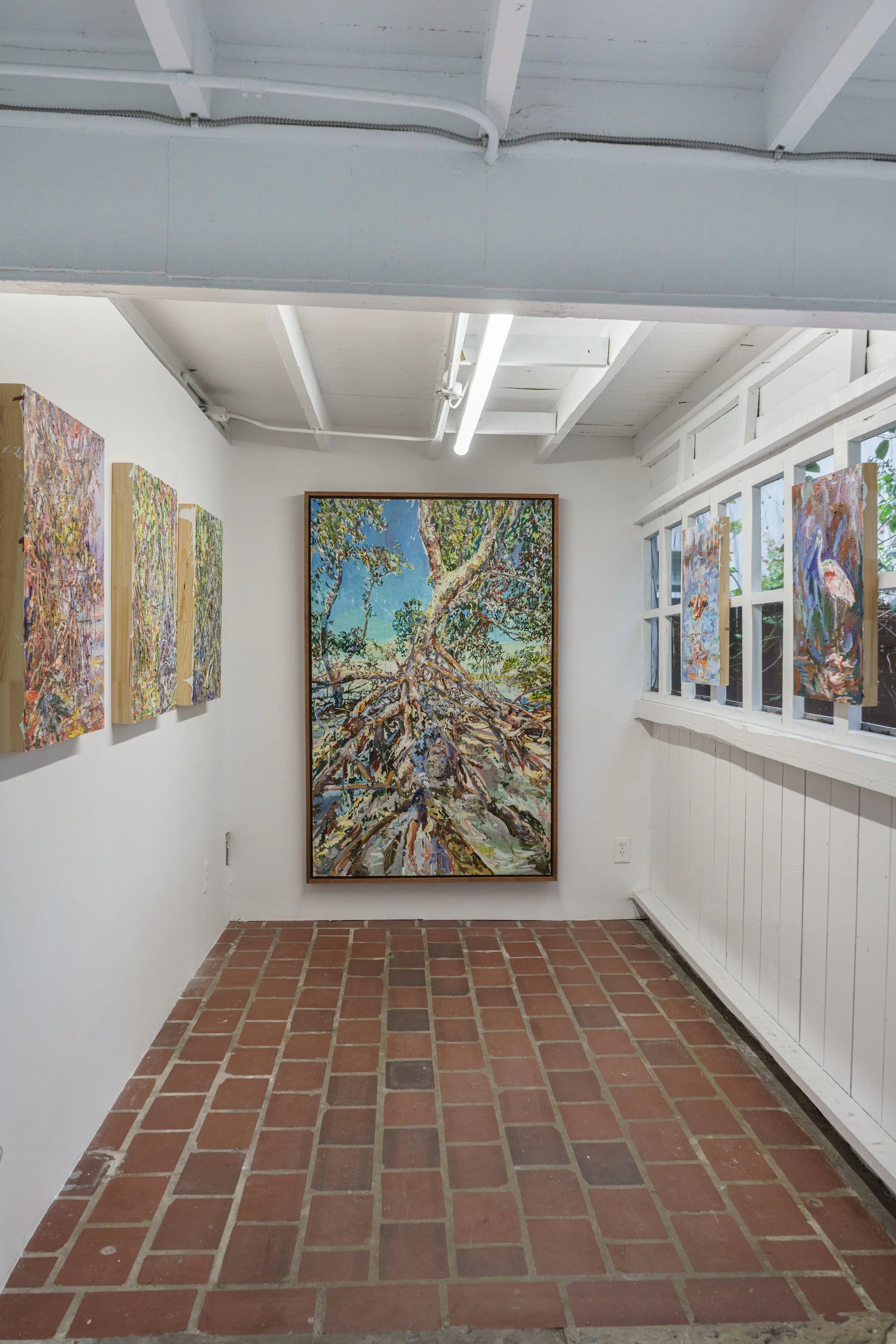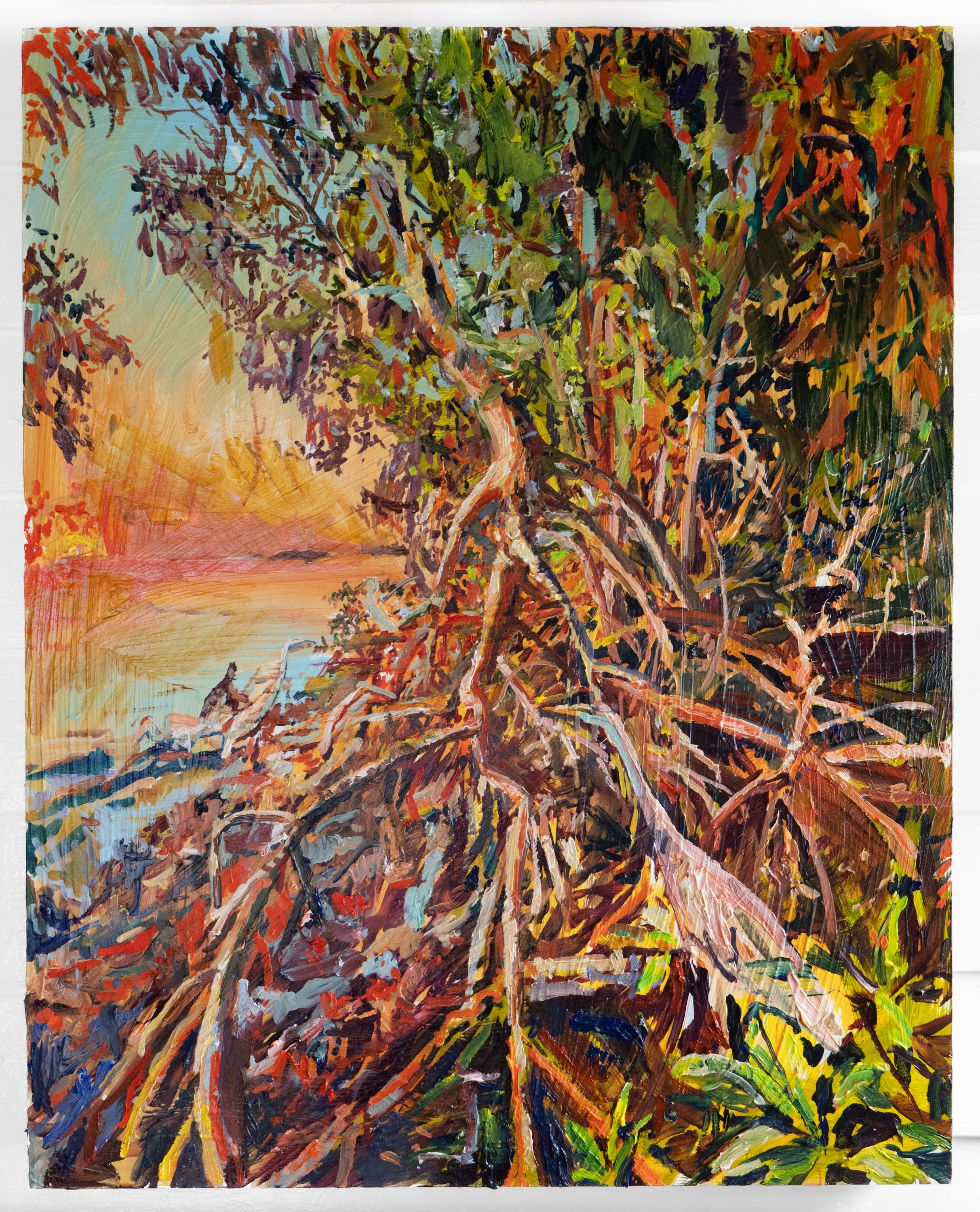 For over a decade, Sodamin has spent days and nights immersed in these ecosystems poling his skiff, sight fishing, camping out, and finding wonder in these entangled mazes. The environment keeps calling him back to a world one can't fully discover. The paintings reflect the harsh beauty he sees in the natural landscape from an experienced eye, depicting ocean and land, each tree with a habitat of snails, birds, snakes, and air plants. Fluid brushstrokes of color reveal oysters, fish, sea moss, and corals. He examines each mangrove as an exploration of an entire universe.