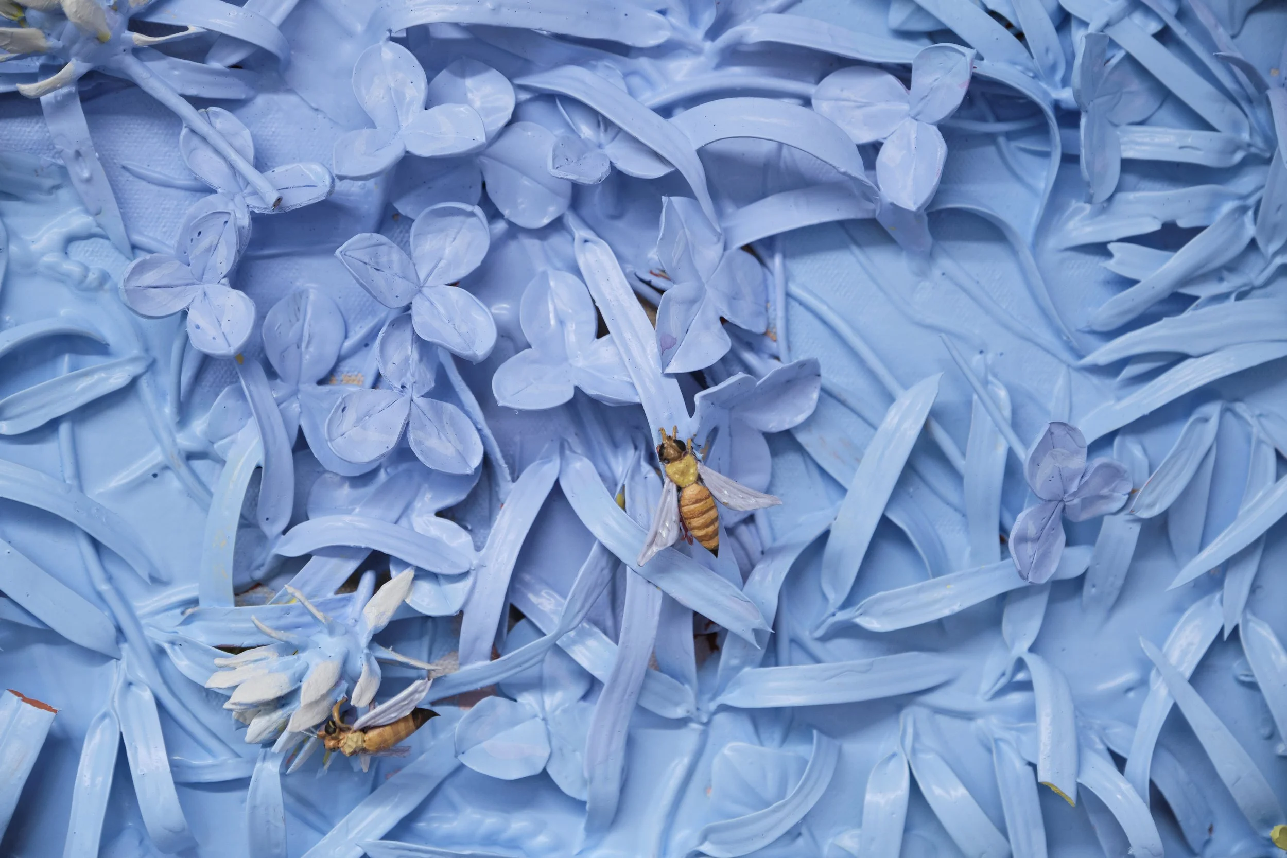 Yard Flowers is a presentation of paintings further investigating Assiff’s interests in weeds, lawn aesthetics, and interior design colorways. The painted lawnscapes of centipedegrass and Bermudagrass are made up of hundreds of individual blades of grass, each produced by extruding methacrylic through shaped dies, which are assembled onto the canvas and doused with a coating of latex paint. The colors are sourced from the 2022 Pantone Home + Interiors color trend report (a document that serendipitously references a 2016 painting from the artist's own Hyperaccumulator series). The resulting monochrome compositions resemble color swatch paint chips.