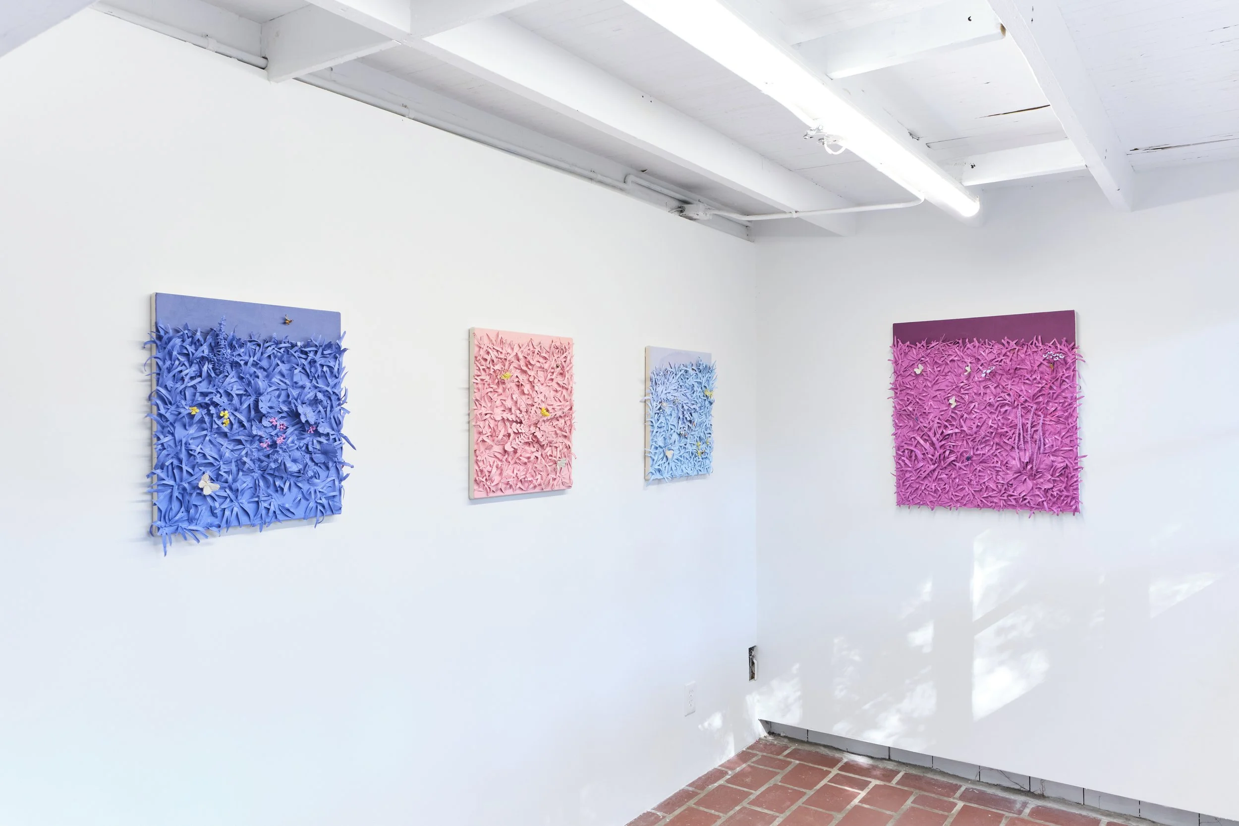 Yard Flowers at KDR305, located in the Little Havana neighborhood of Miami, is an exhibition that engages with the local subtropical landscape invaded by turfgrass lawns - a landscape that is very much familiar to the Florida-born artist. The paintings’ blended ecosystems collapse the world of chemically maintained lawn systems, exterior house paint, and the weeds and insects that persist within it. The paintings in Yard Flowers contain evidence of their cultivation and taming - Assiff "mows" the blades of grass around the edges of the paintings to create an even border - as well as trace histories of the landscape they seek to represent.
