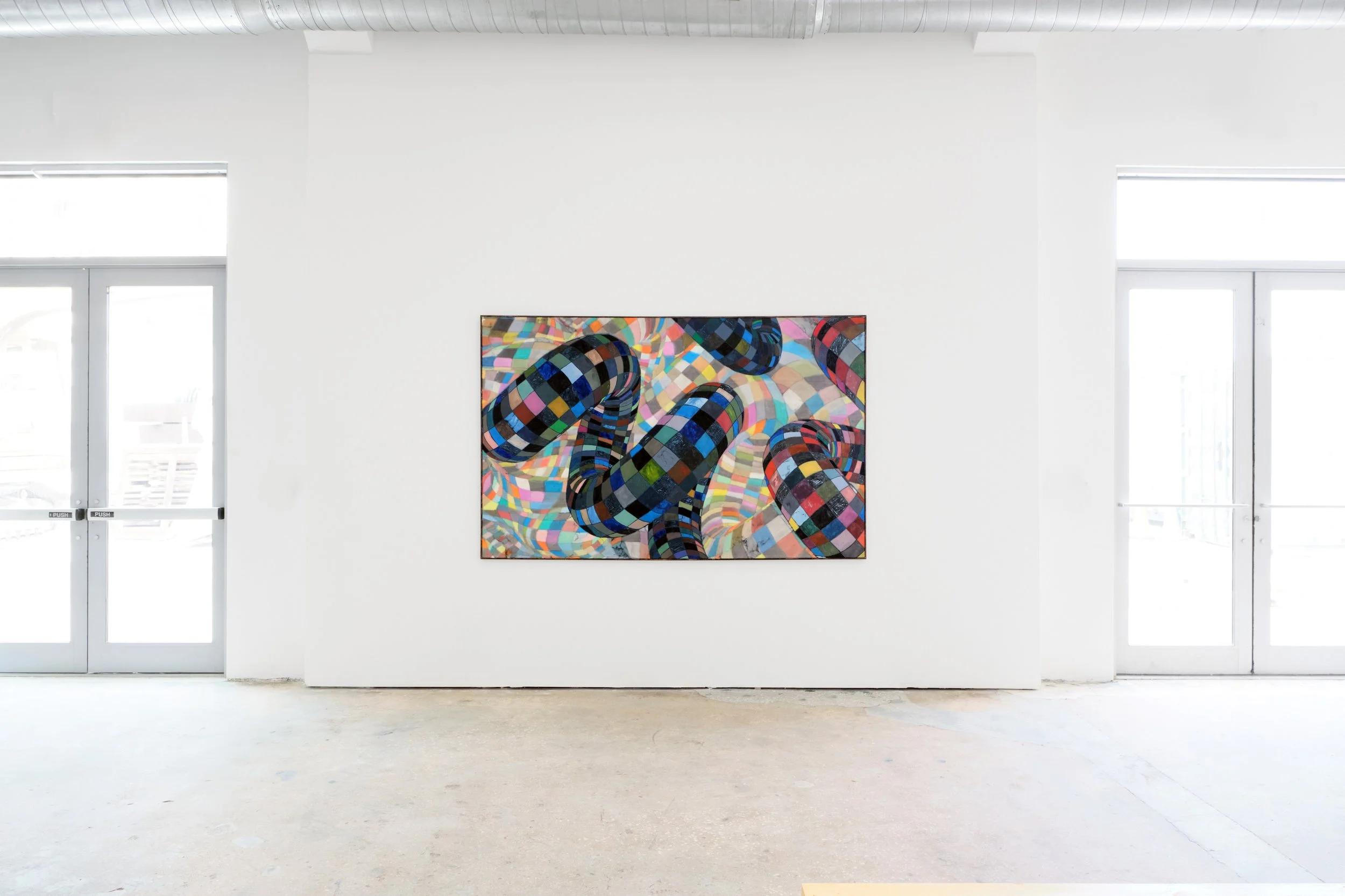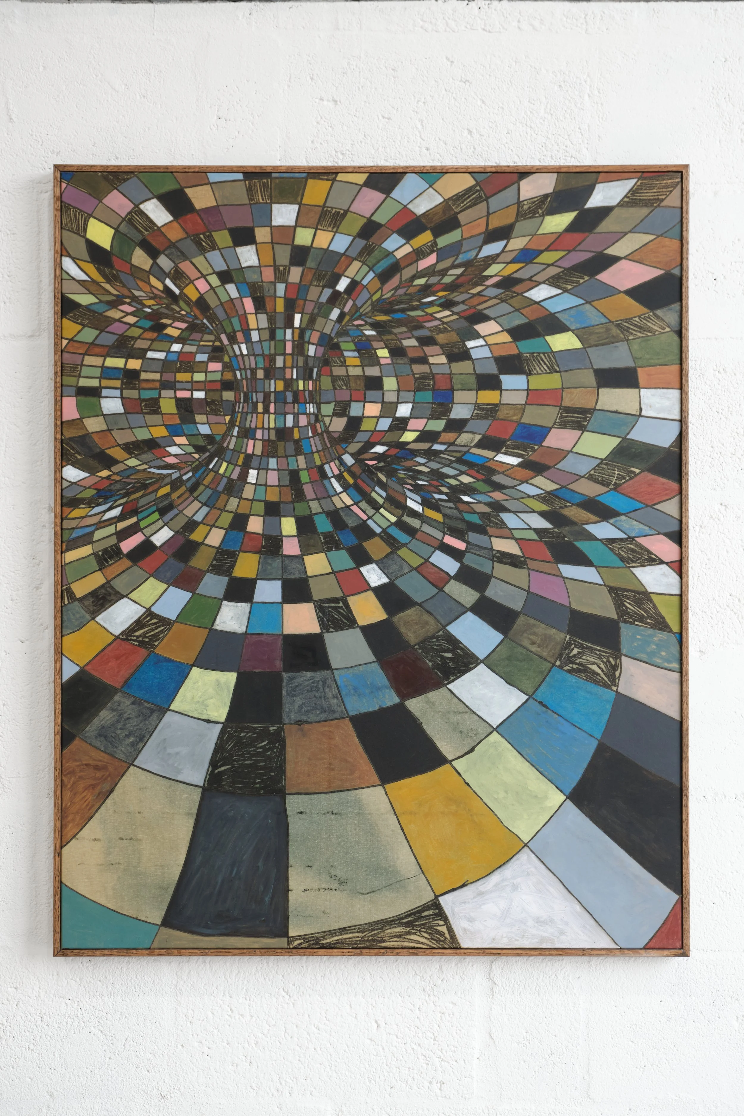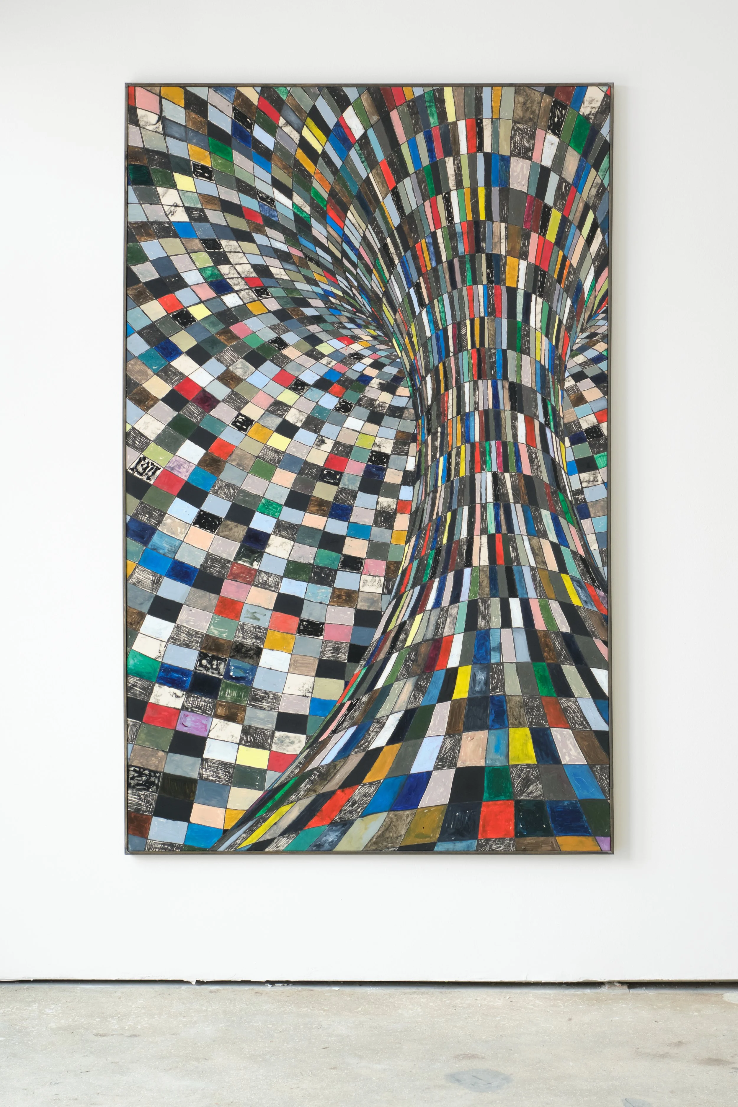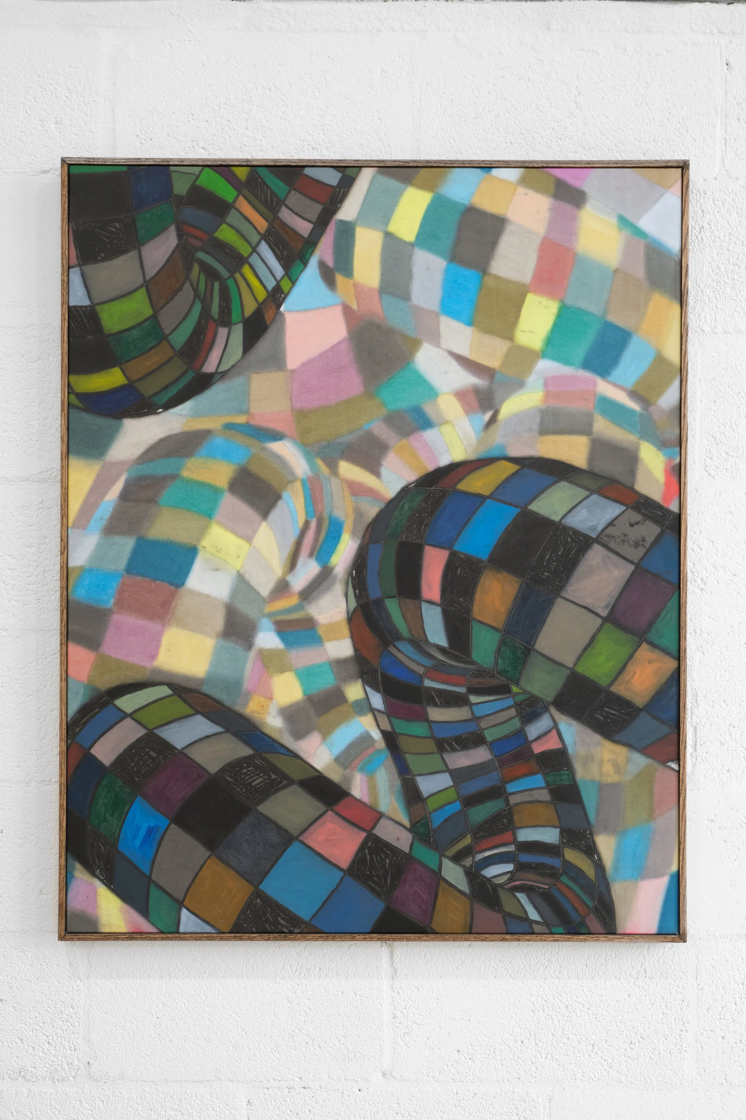 Geometry and space are illustrated through thick black wireframe lines between which colored tiles sit. Each cell of the patchwork grid is treated as its composition through hand-applied brushwork to equalize the parts and the whole. Some paintings carry a more defined background and foreground relation to space. Some softer, almost pastel-like, with bolder forms launching forward, increasing the rough-hewn opticality of the compositions.