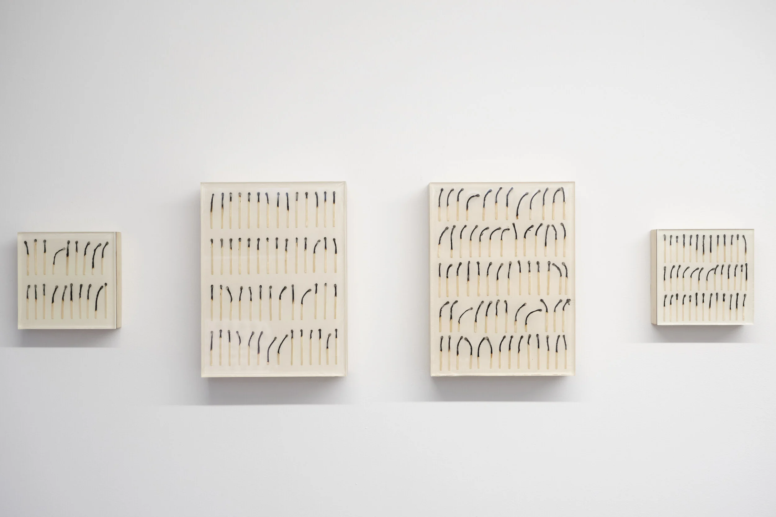 In her match works tilted Nothing is Constant 1-11, Nadeau explores the state of awareness of the individual, using meticulously burnt matchsticks as a metaphorical tool for the awareness of similarity and distinction. The ritualistic process is rule constrained, each match is burnt the same way each time. However, as a result, the matches burn differently every time even if appearing similar at first glance.