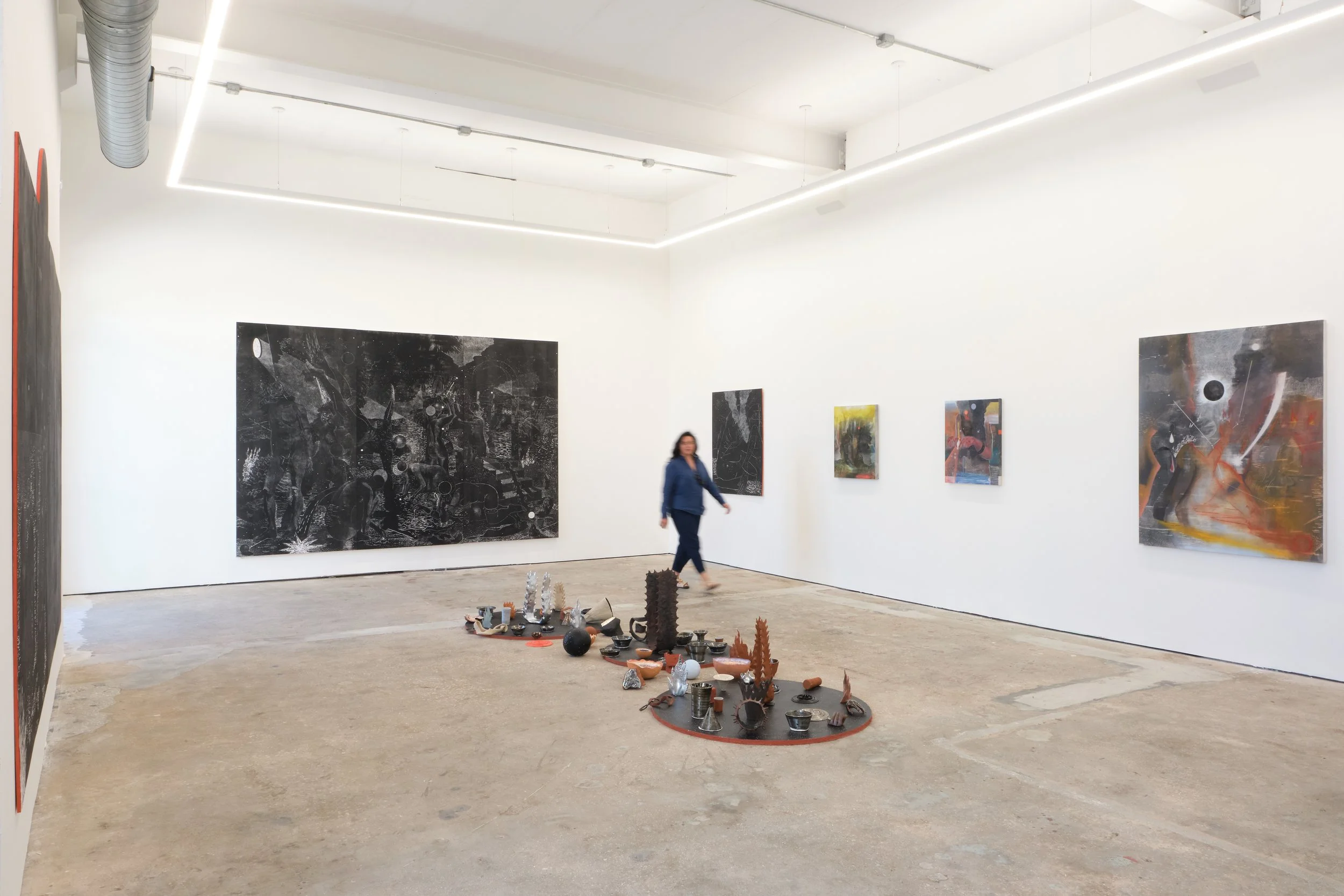 Suárez's environments are populated with totemic architecture, forms that overlap and collapse in space, and illusive bodies that exist between dimensions. We confront portals, shooting stars, comets, and figures basking in otherworldly energies. Oscillating between empirical observation, material experimentation, and poetic and esoteric approaches to making "Cosmic Procession" invites a journey beyond ordinary perception, revealing existence as an intricate tapestry woven from matter, culture, and the unknown.