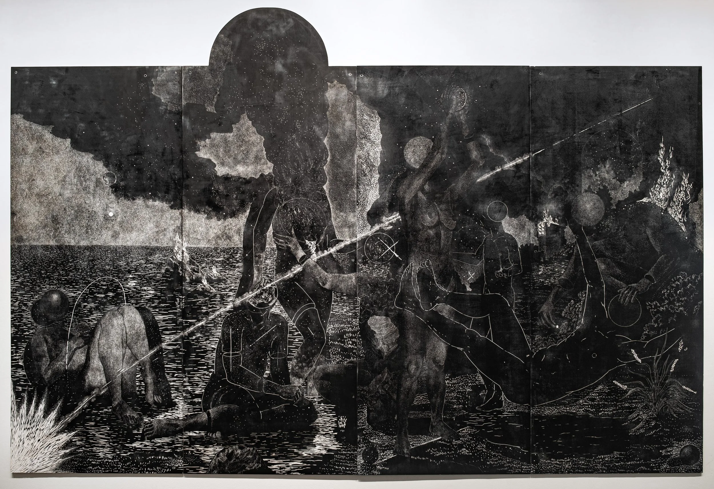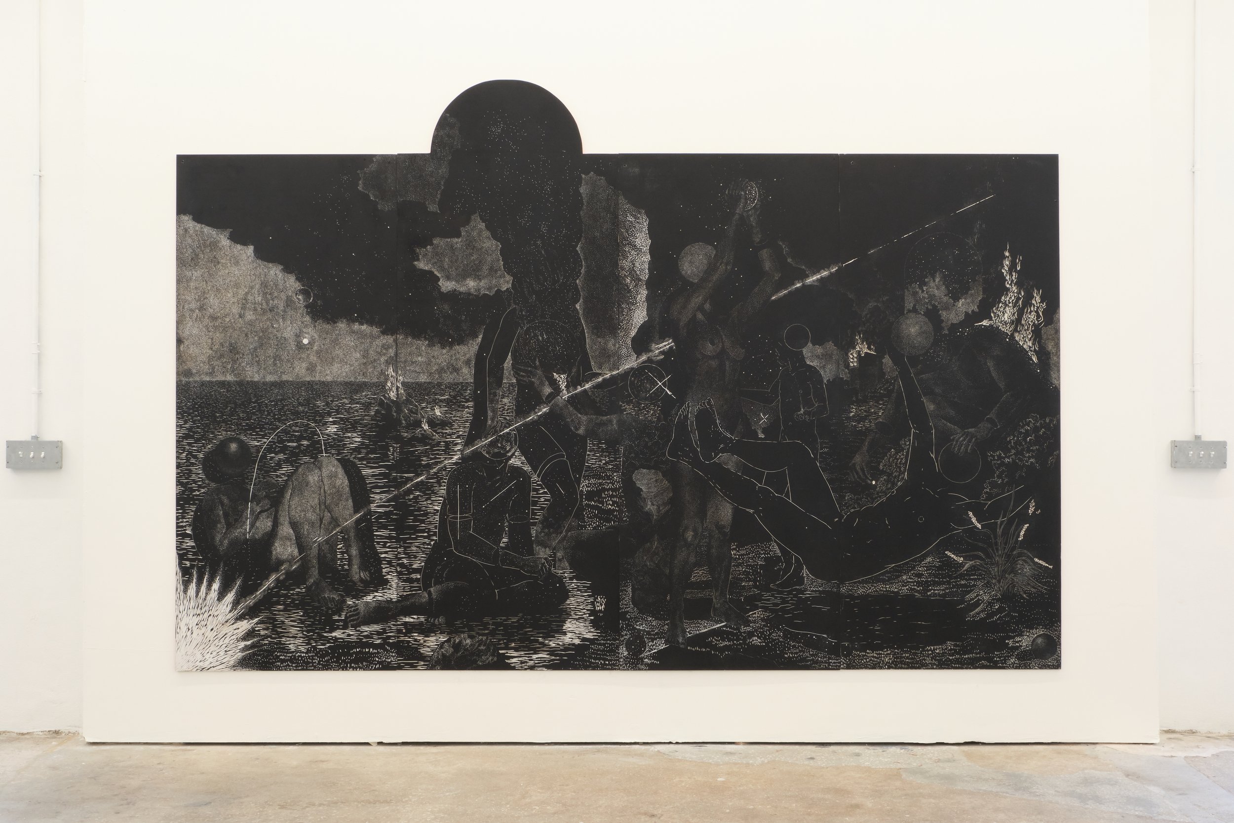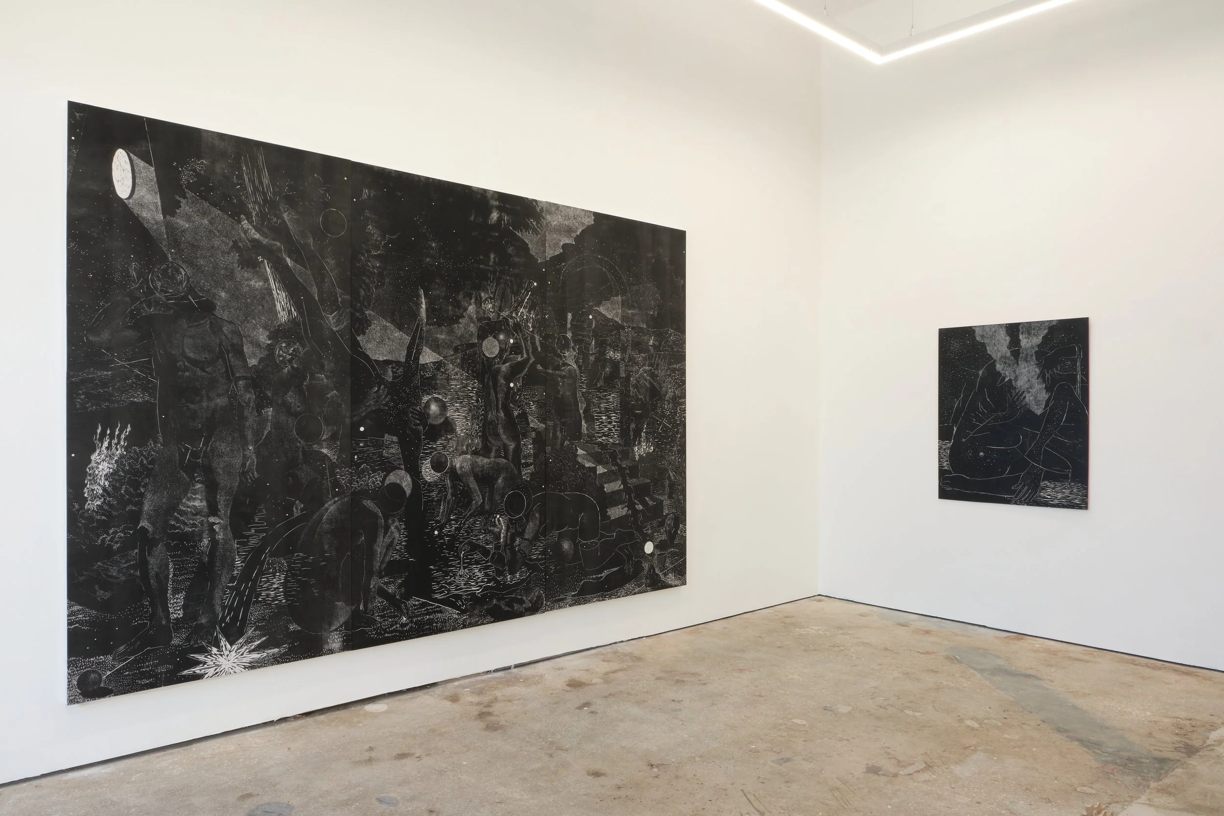 Image: Sergio Suarez, La Incesante Fragmentación del Ser, 2023, Ink on carved wood, 86 x 144 in., 218.44 x 365.76 cm, SS0010