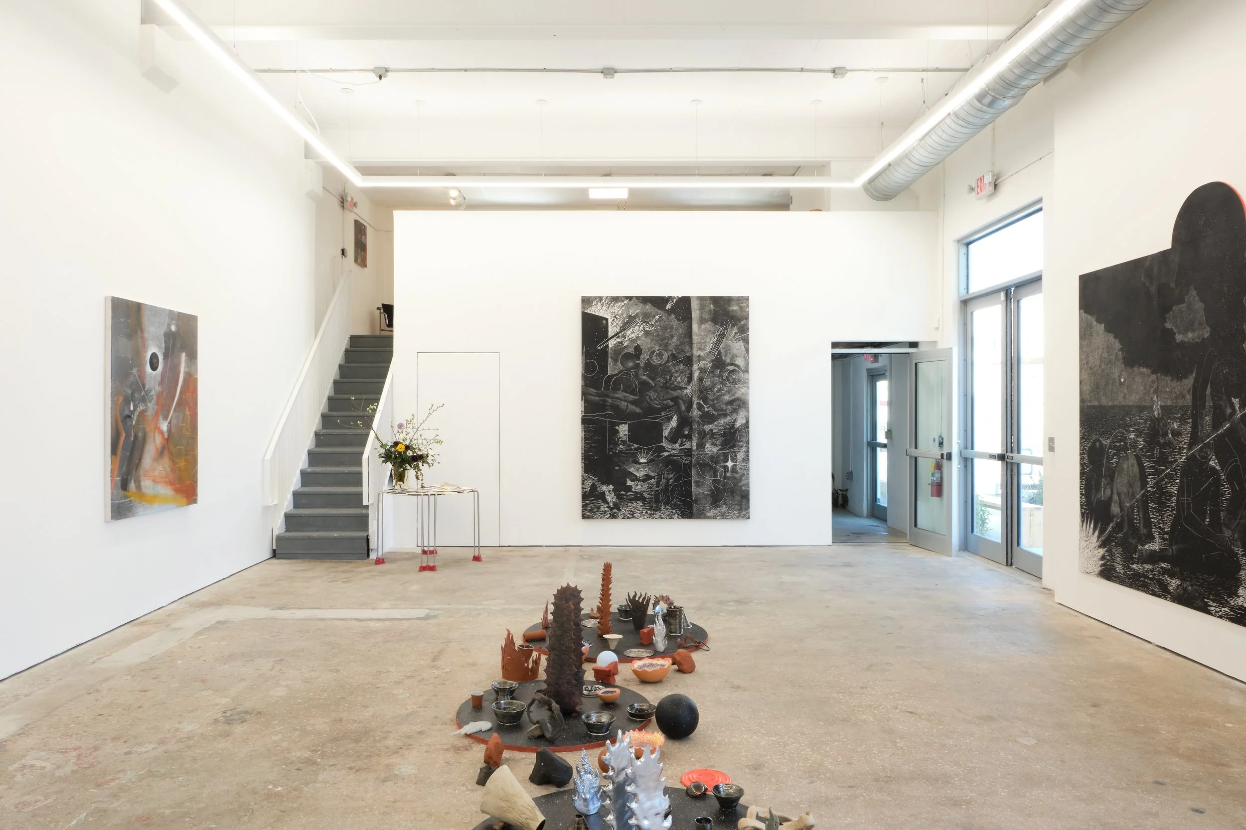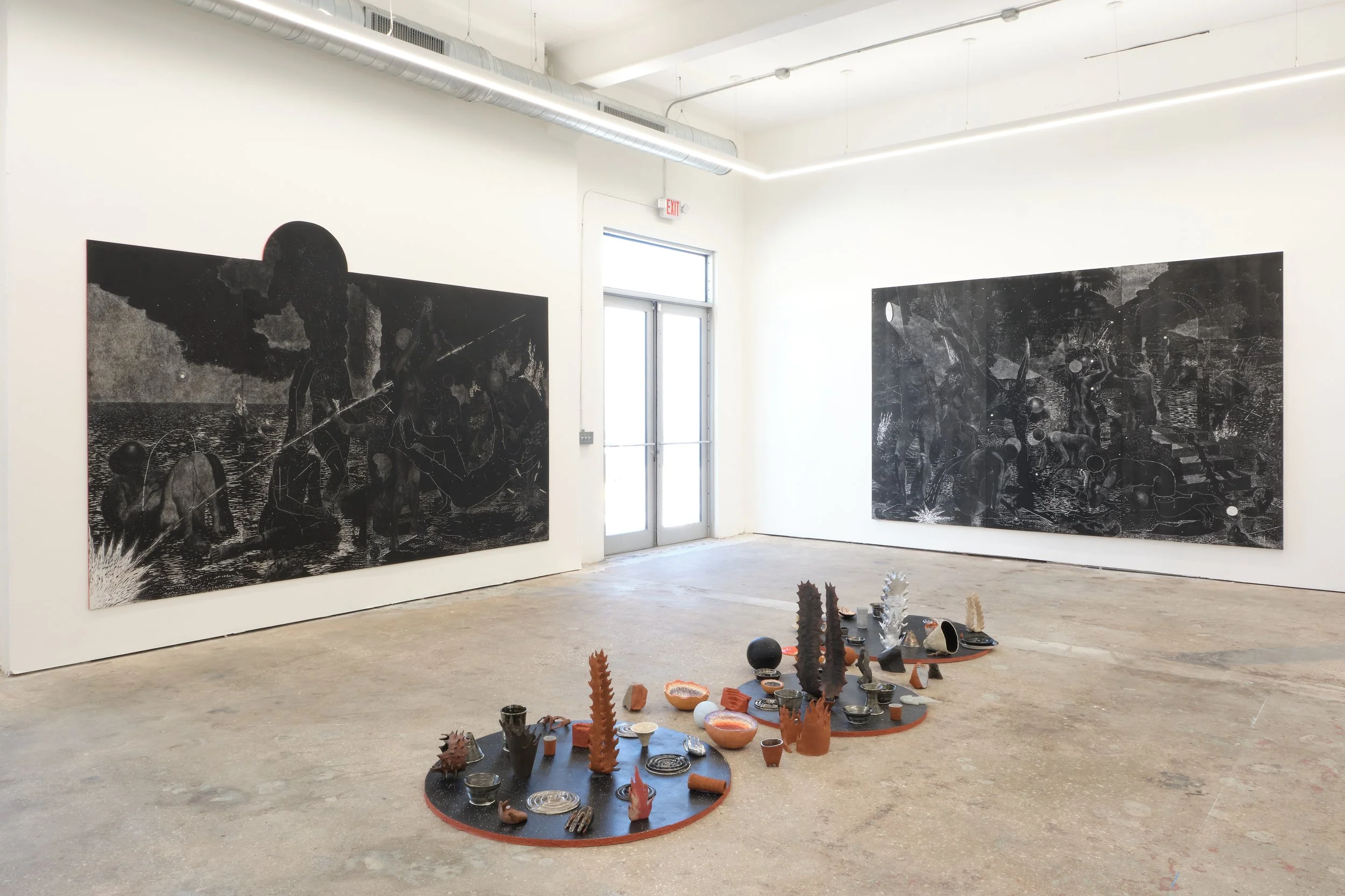 In "Cosmic Procession," Suárez takes us to a liminal space where astral and material planes converge. His recent explorations of varied materiality and image construction draw ideas from baroque painting, Mesoamerican objects, and telescopic observation. Suárez constructs a visual lexicon that interplays syncretism and porosity. Through woodblock carving, painting, and ceramics, he blends ritual symbolism with contemporary cosmology.